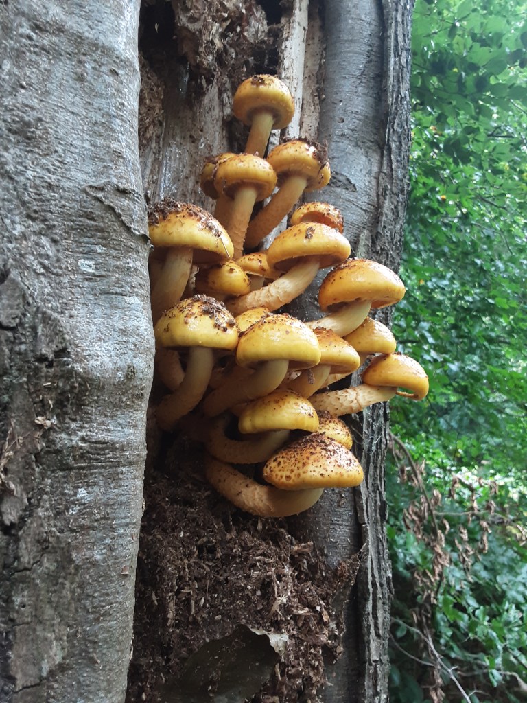 Honey fungus pokes out of a tree fairly high up the trunk. The tree is already dead, whether from this onslaught or another cause. The graceful sculptural form of this amber fungus can also be found in the dried mushroom selection at Waitrose! This is despite some cautions as to individual reactions to eating Honey fungus.