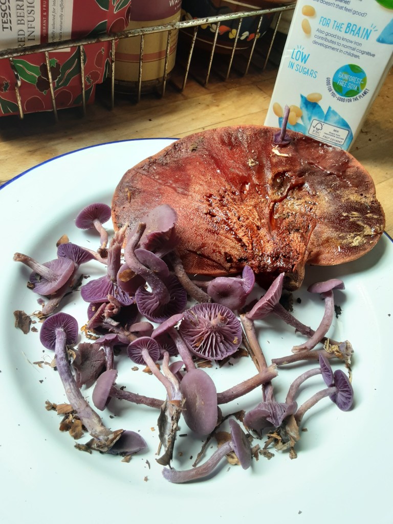 Amethyst Decievers are a stunning subtle purple colour, with a suede like feel and in rolled cap. They are small, but we got enough to make a bowl of Amethyst Miso Noodles. Phil shows me how to tell by the bank of earth that we are heading into ancient woodland, where we find many more mushrooms.