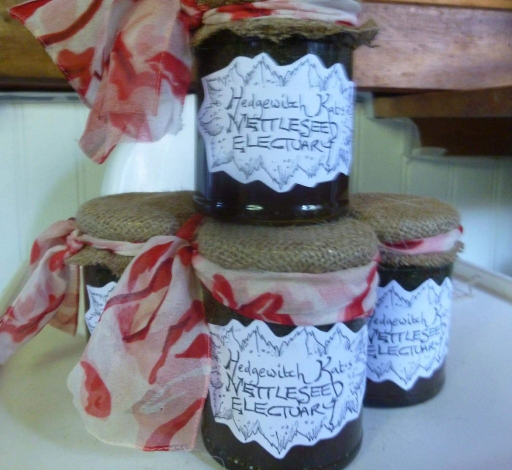 There are all sorts of delicious recipes you can make with nettle seed. Add to a salad, stir fry, any way you would use hemp seed. Put in breakfast yoghurt or a smoothie. I make Nettle Seed Electuary, which is dried seed crushed with a pestle and mortar then mixed with honey. It keeps for years and is great taken daily as a tonic for hair, skin, adrenal (kidneys and liver) and thyroid system. It is also an aphrodisiac!