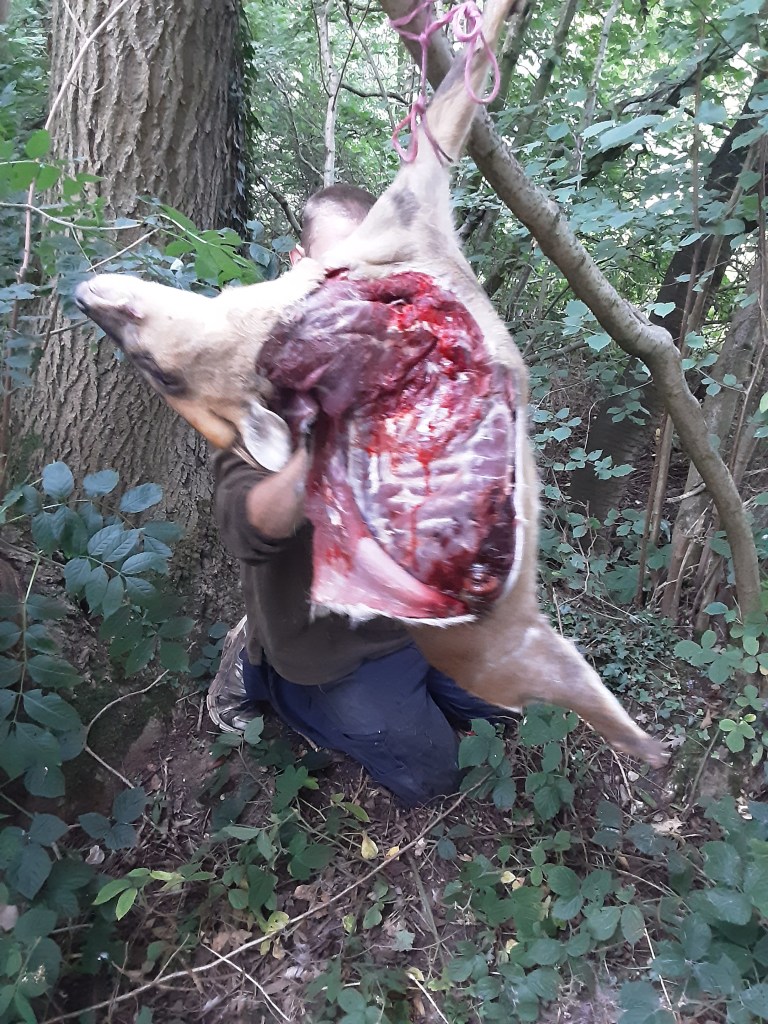 As you can see, my other mistake was to puncture a hole in the abdomen and the deer’s guts fell out, leaking expired deer poo 💩 all over our hands. After a brief break to wash it all off, we finally skinned and took off the two front legs. We bagged it all up and found we had over 5.5kg of venison to hand out to friends and cook 2 big meals for the carnivorous people of the farm!