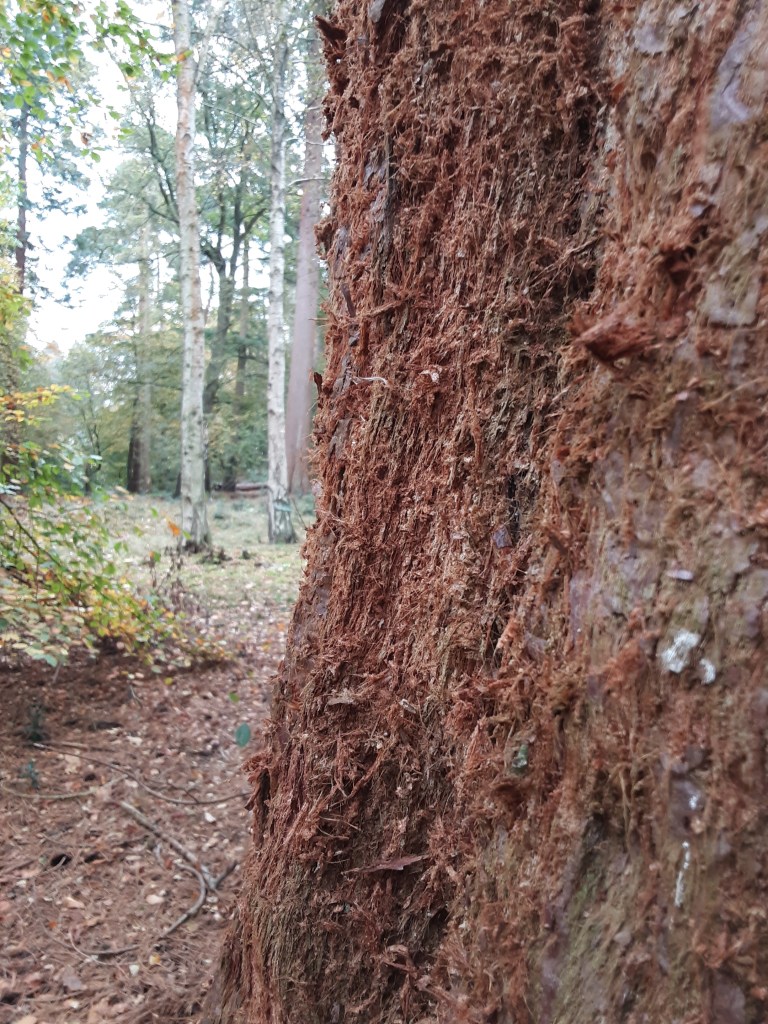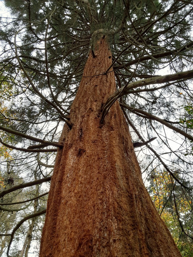 On our first Tree ID foray into Plantation Wood Phil and I happen upon a Wellingtonia, or Giant Sequoia, Sequoiadendron gigantum. The vast tree tilts skyward, and my fingers push into the thick shaggy burgundy fibres of the bark. Normally they grow about 50m tall, but in their native valley of Sierra Nevada in California, they can grow up to 90m tall. The tallest Giant Sequoia, ‘Hyperion’ is 112m tall, whilst the widest is General Sherman at a diameter of 7.7m. General Sherman weighs as much as 400 elephants – that’s about 200,000 tonnes!