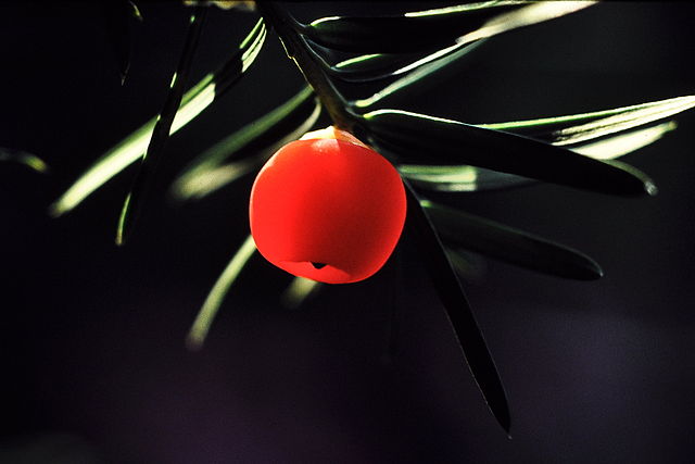 DO NOT EAT THE SEED WITHIN. Or the leaves, or the bark. Or the wood, should you have felt the urge. Yew, or Taxus baccata, contains the lethal alkaloid taxin, which causes cardiac arrest, coma, and, obviously, death. I recently read about a 39 year old idiot who made a bet with his friend and voluntarily drank a cup of yew needle tea. The only reason he didn’t die was the fact apart from every other heart stimulation the hospital could throw at him, they used the antidote to taxin. He was in a coma for weeks. (This just shows why there were less men than women cave people in the olden times).