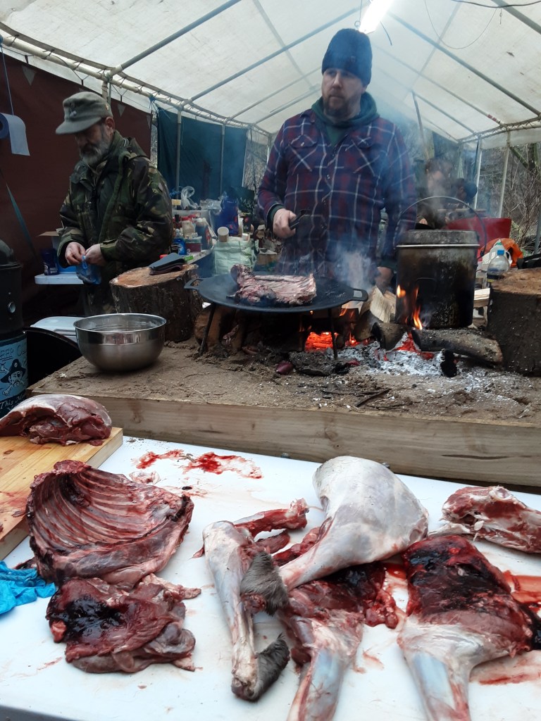 The guys then brought in two (already deceased) deer, a muntjac and a fallow, and showed us how to butcher them. Fans of my earlier posts will know that I have already done this, badly, with a roadkill muntjac. So it was interesting to see how to do it properly. the main idea was to completely gut the Deer as soon as it is killed to prevent spoiling (which I didn’t do before). Wayne let everyone get stuck in learning how to do it, but I had to go off and pull my son out of the stream again. Here you can see the two skins after they finished and the meat was carried to the kitchen.