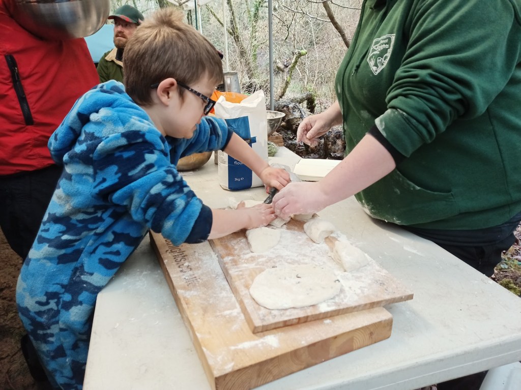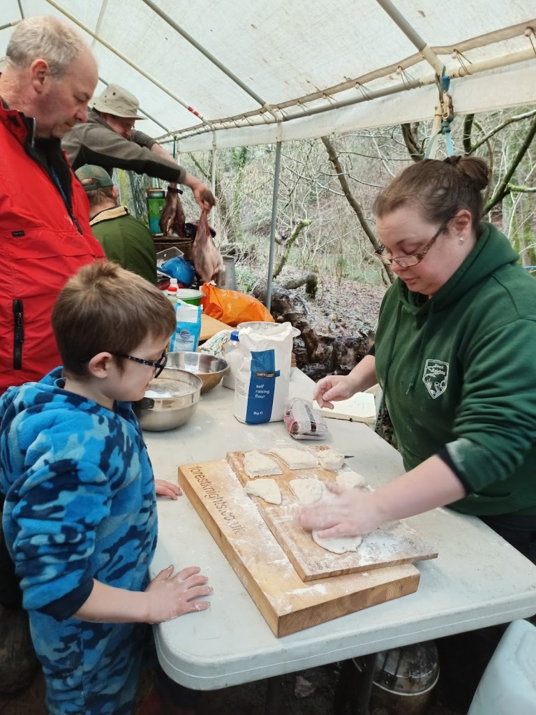 Beth showed us all how to mix kefir, vinegar, bicarb of soda, flour, and either rosemary or raisins into little flatbreads which we cooked in a pan with garlic butter and oil. Delicious on a cold and damp day in the woods! The kefir contains healthy bacteria which help you digest your food, and gives bread that lovely sour-dough taste. Marty got stuck right into this bit, (even if he did have to wash his hands three times before Beth would let him near the dough).