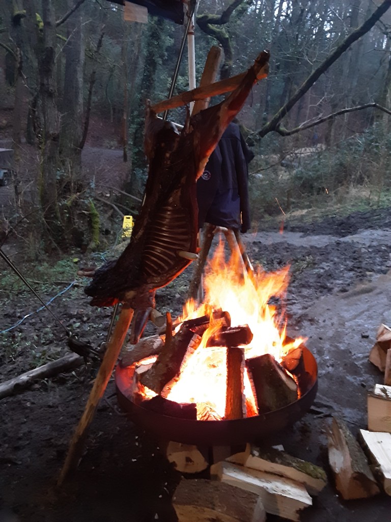 The muntjac was split in half and tied onto a wooden frame, which was hung over the fire pit. Wooden stakes held out the bottom half. At first it wasn’t close enough and had to be brought down lower to cook. Judging the distance can be tricky. There was also a great design for a wooden stake kettle holder which had notches in the back to adjust the height of the kettle. I was worried the kettle would slip when I let it go, but the tension of the bent stake prevented it doing so.