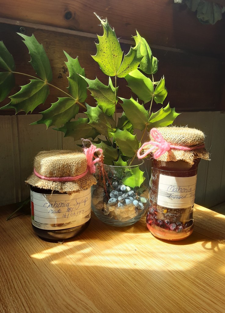 There are over 70 species worldwide, but the most common Mahonia planted in the UK are Mahonia japonica and Mahonia aquifolium. M.aquifolium has rounder berries. You can use them both the same way.