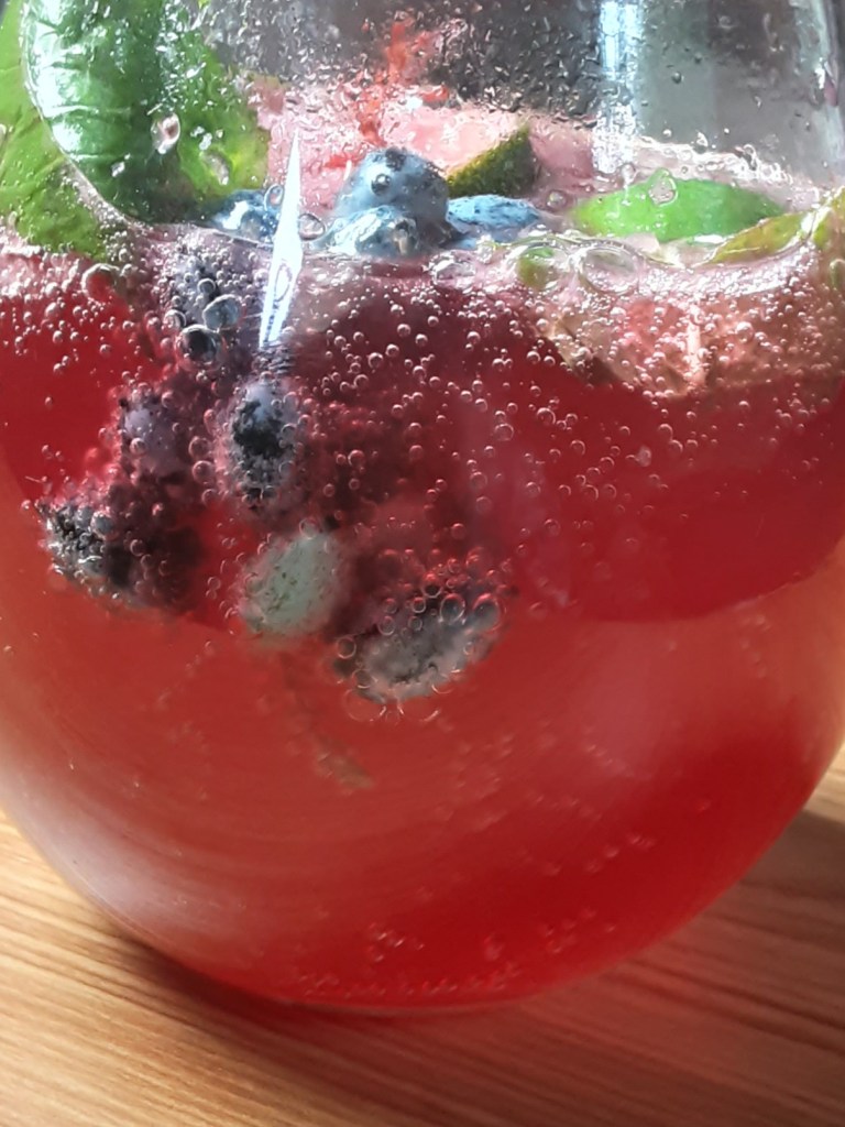 My Mahonia syrup, mint leaf, grape juice, lime and sparkling water mocktail. I got the recipe from Lottie Muir’s book ‘Wild Cocktails’.