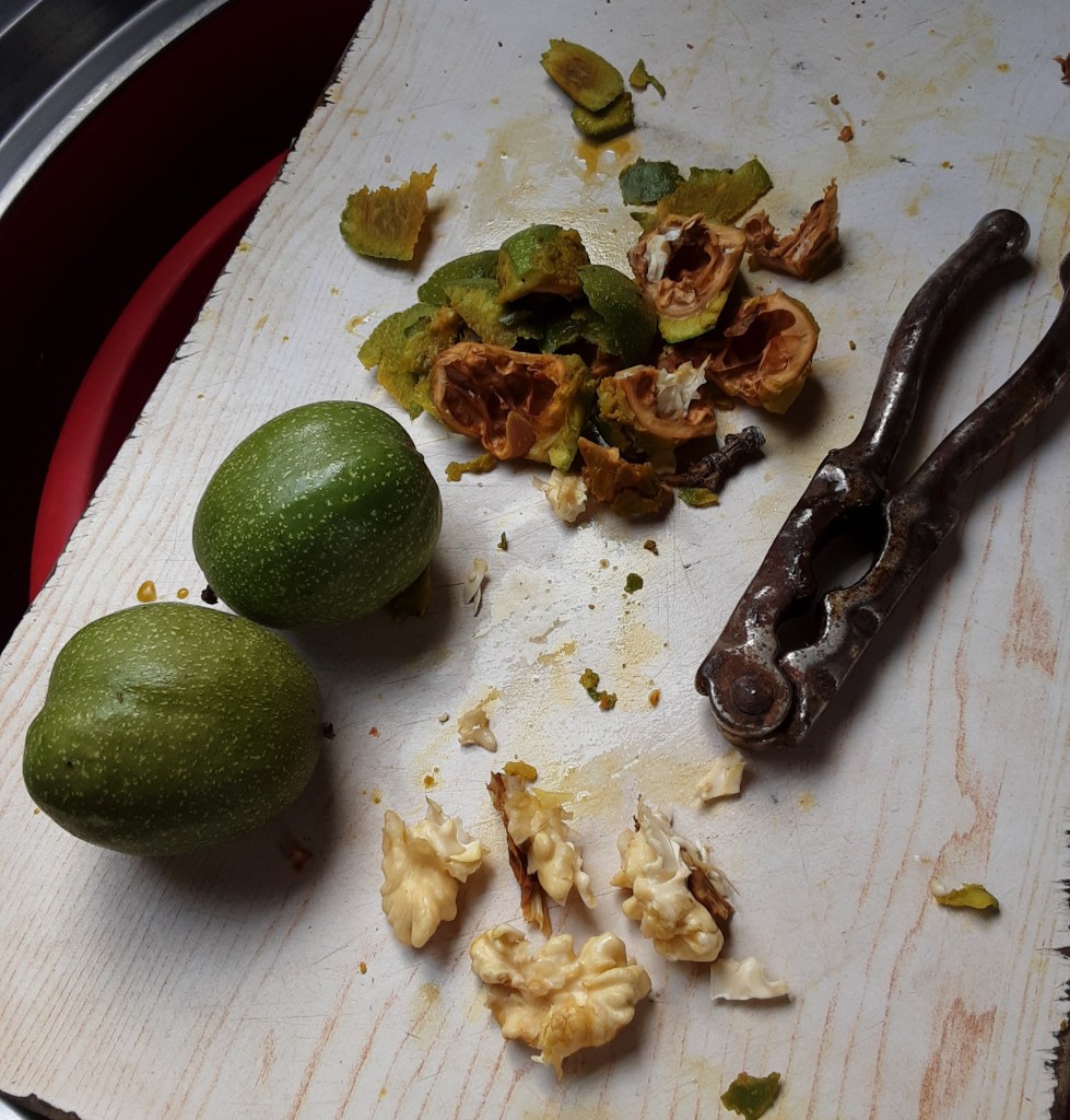 There’s two types of walnut you will commonly find in the UK: the Common Walnut and the Black Walnut. They can both be used the same way in meals, though the Black Walnut can vary in tastiness and be harder to harvest due to the tree being really tall. The nuts are generally ready to harvest once the leaves of the tree start turning yellow and they begin falling to the ground. Below is a walnut tree, leaf and crushed nut (from the tree we walk past on the school run).