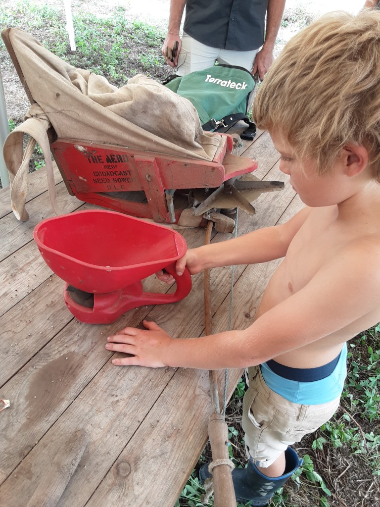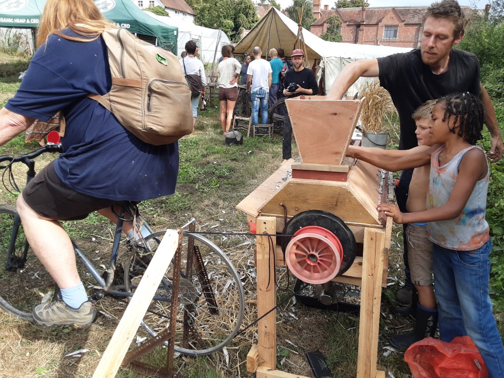 Farmer Andrew Brackenborough showed off how to operate his home made bike powered threshing machine, with my son helping loudly. We threshed broad beans and barley. It was surprisingly easy on the legs!