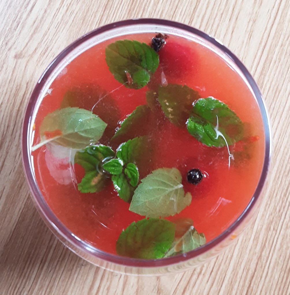 Sprigs of mint and rose hips for garnish