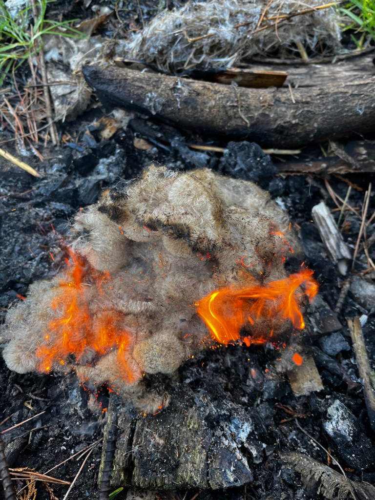 I took all this lot out to the fire pit (a hole dug in my garden) to test them out. I’ve already played with Reedmace seeds as tinder before and made rush lights out of the stems, so I pulled that out first.