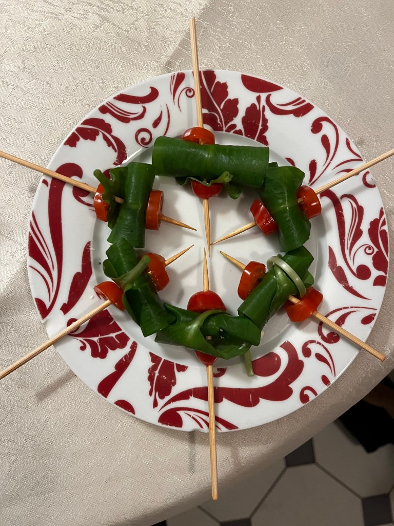 - Push a tomato round onto the stick then follow with the rolled up wild garlic leaf with cheese in.