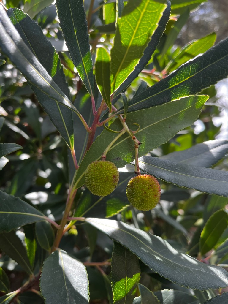The Strawberry Tree is not related to strawberry plants. It does have sweet, tasty spherical fruits which look like knobbly stress balls though! The fruits go pink to red when ripe. You can just eat them straight off the tree.