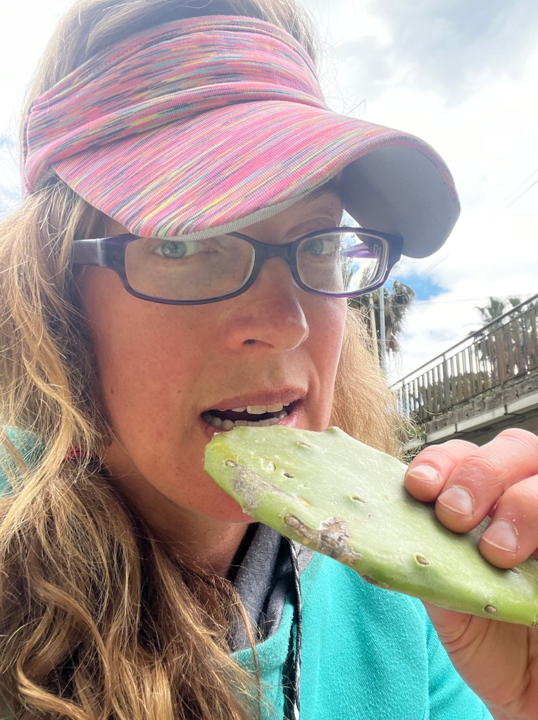 Another thing you can do is burn off all the spines by holding the fruit or pad over a fire. Another thing we were missing, being in a hotel!