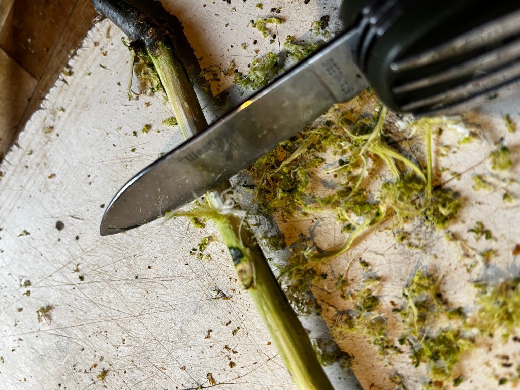 Oak cambium is the thin green layer under the outer bark. This is the part of the tree which carries sugars, water and vitamins around it. There’s a trick to the way to hold the knife so you get cambium and not a load of wood.