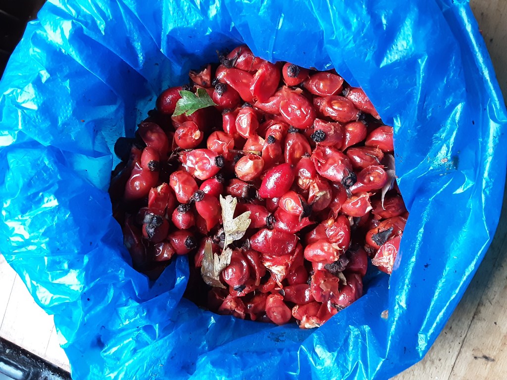 Rosehip harvesting tip: Pick the soft, faded looking hips. These have been bletted by frost. Squeeze near the plucked end. The puree should come out in a worm or poo like string…don’t let that put you off!!