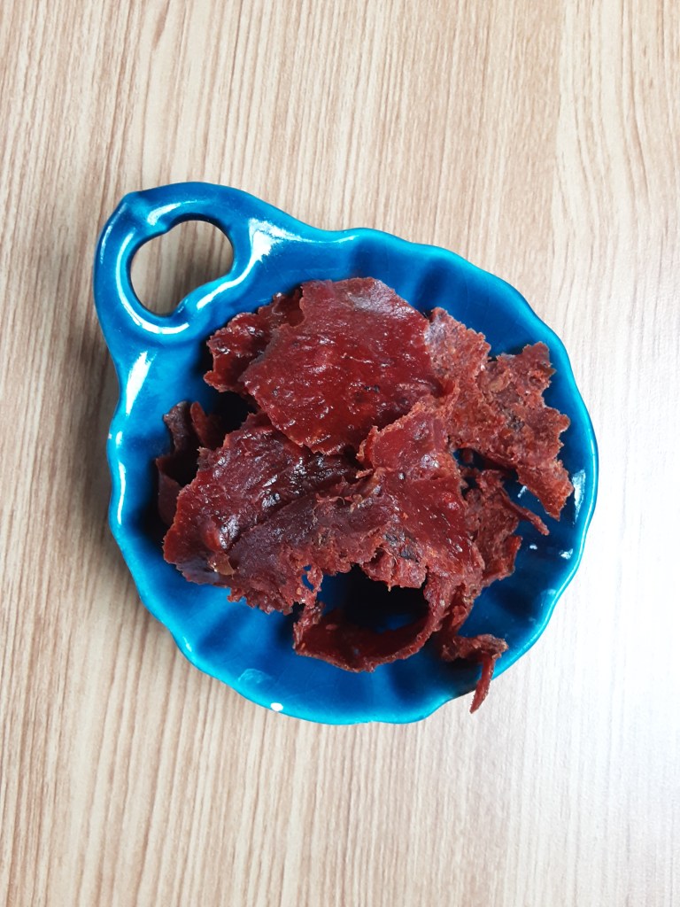 8) When consistency is like leather to touch, remove from heat and allow to cool. Cut into 3cm wide strips (or flakes if that doesn’t work). Peel off tray/paper.