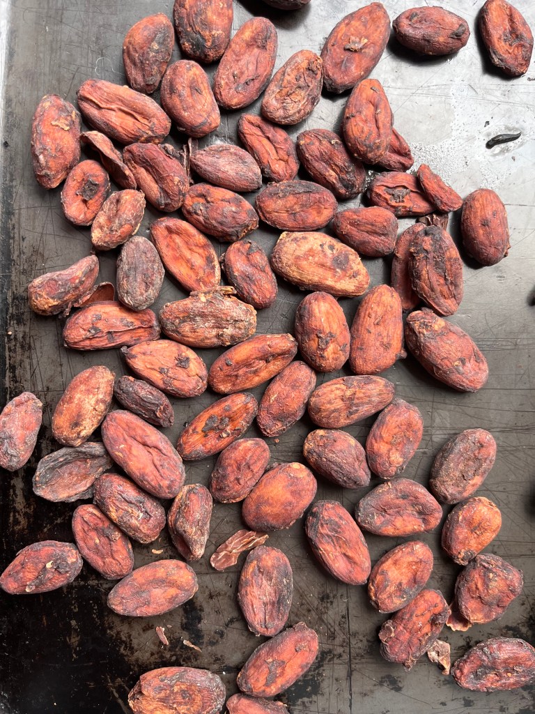 We got these cacao beans from a plantation in Madagascar last summer.
