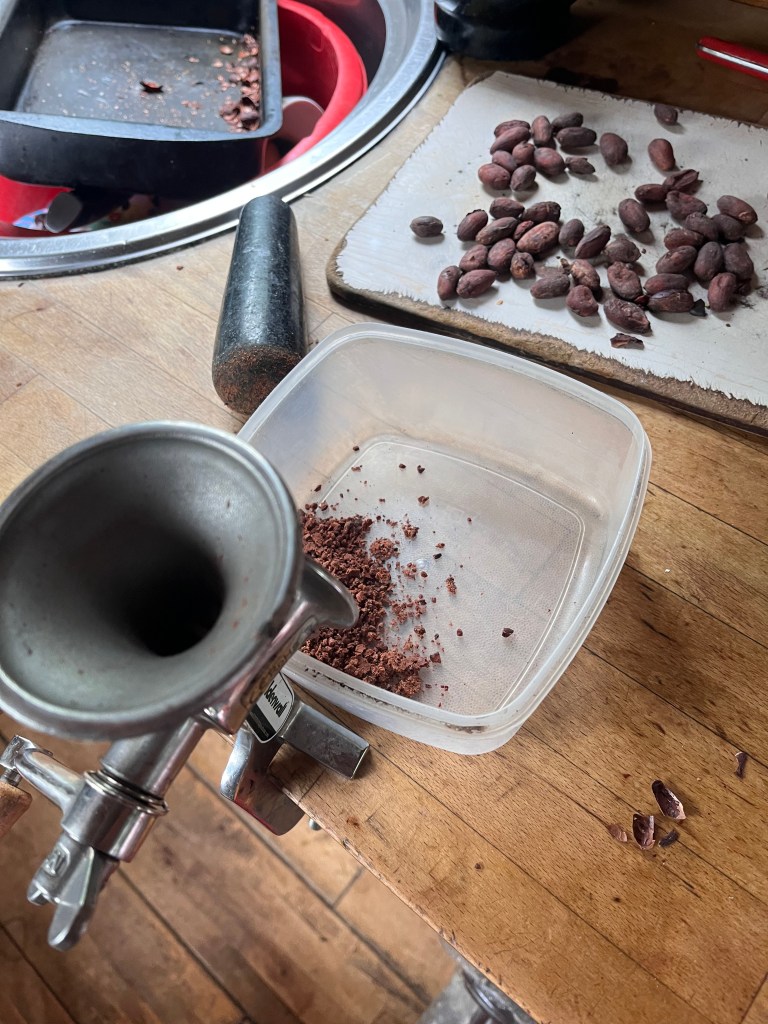 I winnowed the skin off them, then crumbled the bits into a pestle and mortar. I crushed them with this then put them through my hand mill too.