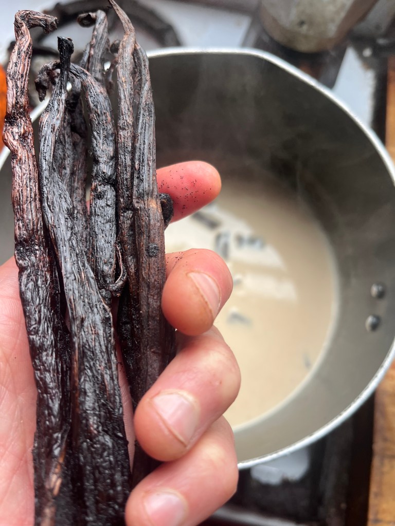 I added 1 cup oat milk with vanilla seeds out of 2 pods…we (guess what) got these from Madagascar. I’m not going to lie and say I found it in an English hedgerow.