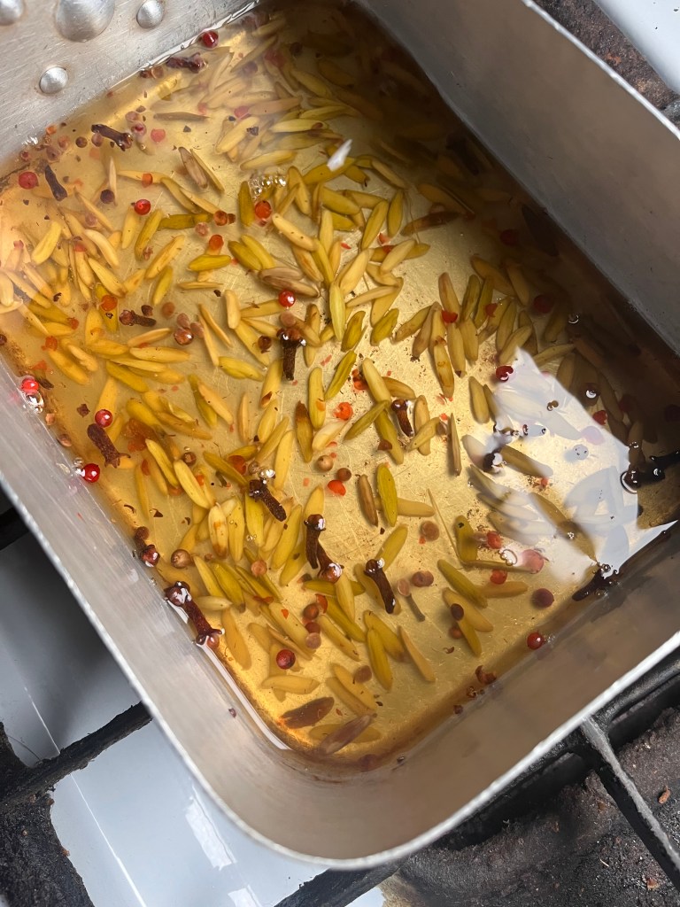 I add 1 tbsp coloured Madagascan peppercorns (any peppercorns will do, I’m just showing off), 1 tbsp whole cloves whilst gently heating. Without boiling, i take it off the heat after 5 mins, allow to cool, and pour into a small jar. I’m waiting several weeks before using in the same way as capers.