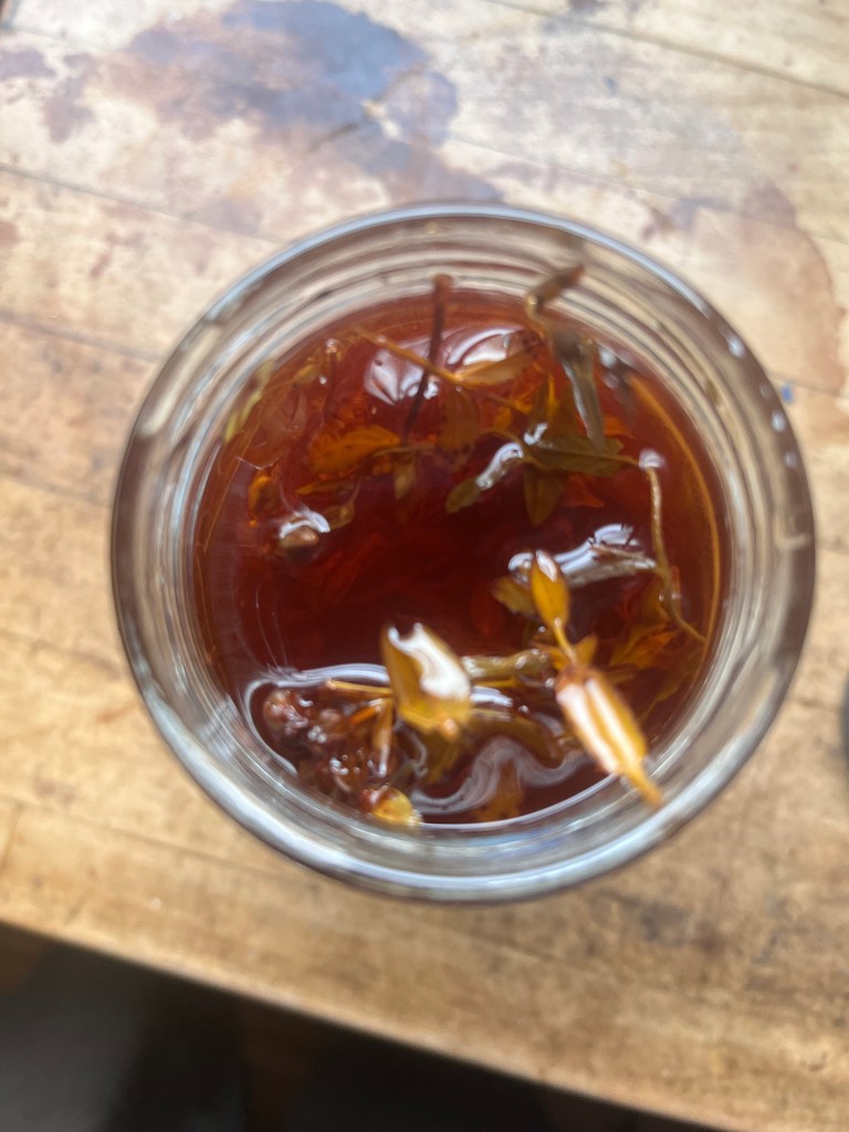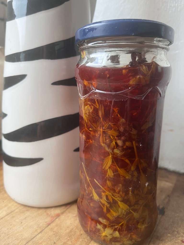 I’ve made a new batch of St John’s Wort Oil ready to turn into salves this weekend. It took 2 weeks of sunlight to infuse this oil to a deep red – this is the hypercin extracted from flowering St John’s Wort tops.
