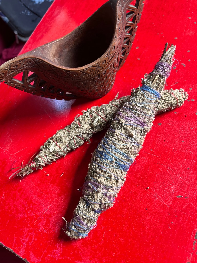 We made and burned Mugwort Smudge Sticks to keep biting insects away. Plus, it cleanses negative energies. A win win situation.