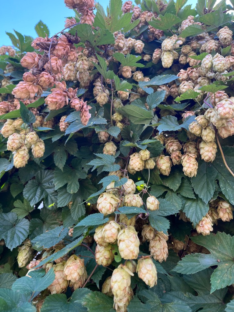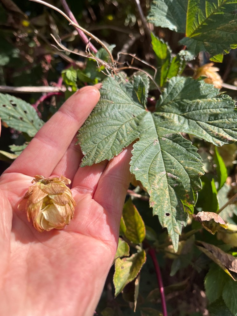 Hops droop (like brewer’s droop haha) from the hedge down the way. Once golden and dry, the strobiles (flowers) make you smell like you have been down the town for a sneaky half if you rub them.