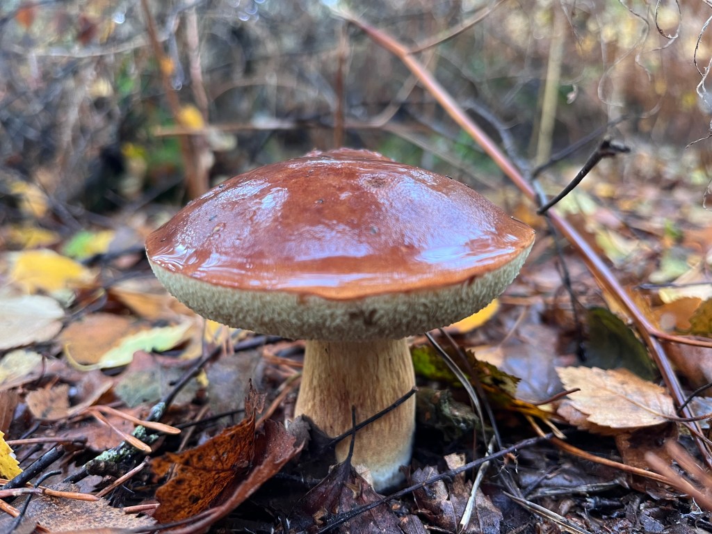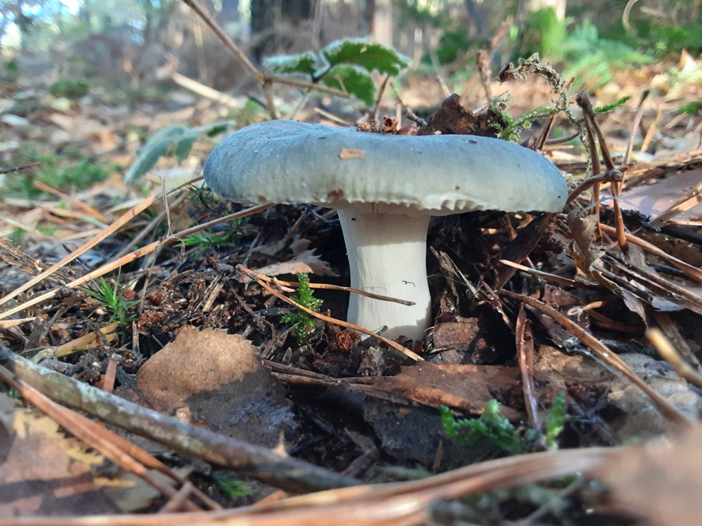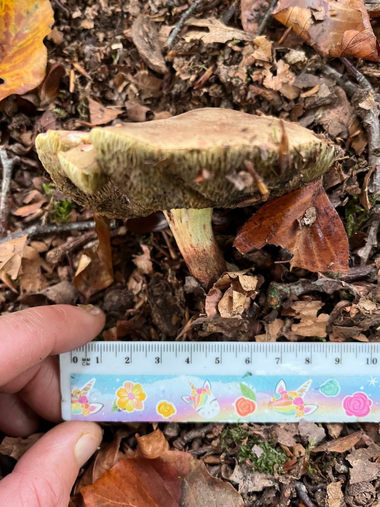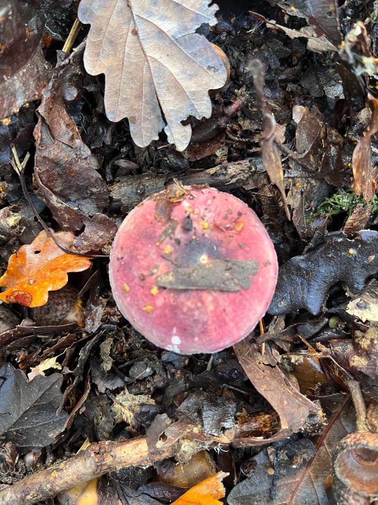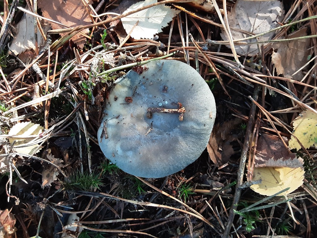 The Bay Bolete (Imleria badia) is a good edible. It’s a lovely deep chestnut colour on the cap and smells like Christmas turkey with gravy. Don’t be put off by the fact it turns blue when cut or even gently pressed. This is due to boletol, a substance which many boletes contain. It’s not harmful. Checking there are many, I only take one for my lunch later. Very nice it is too, fried on buttered toast.