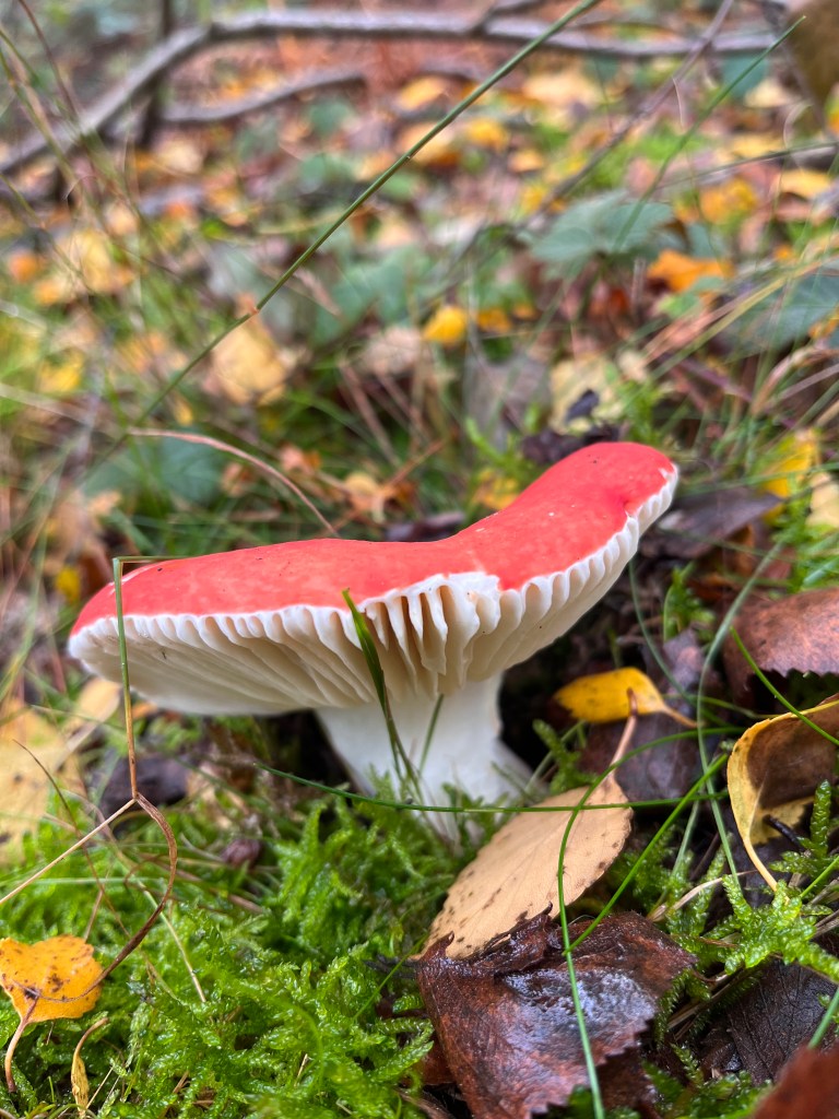 Further up the bridle path, I take my students to see the Sickener (Russula emetica)that I found here on my recce a few days before. This stunning fungus has a wardrobe that could rival a Disney princess, but the cuteness belies its mouth-burning, gut-punishing poison.