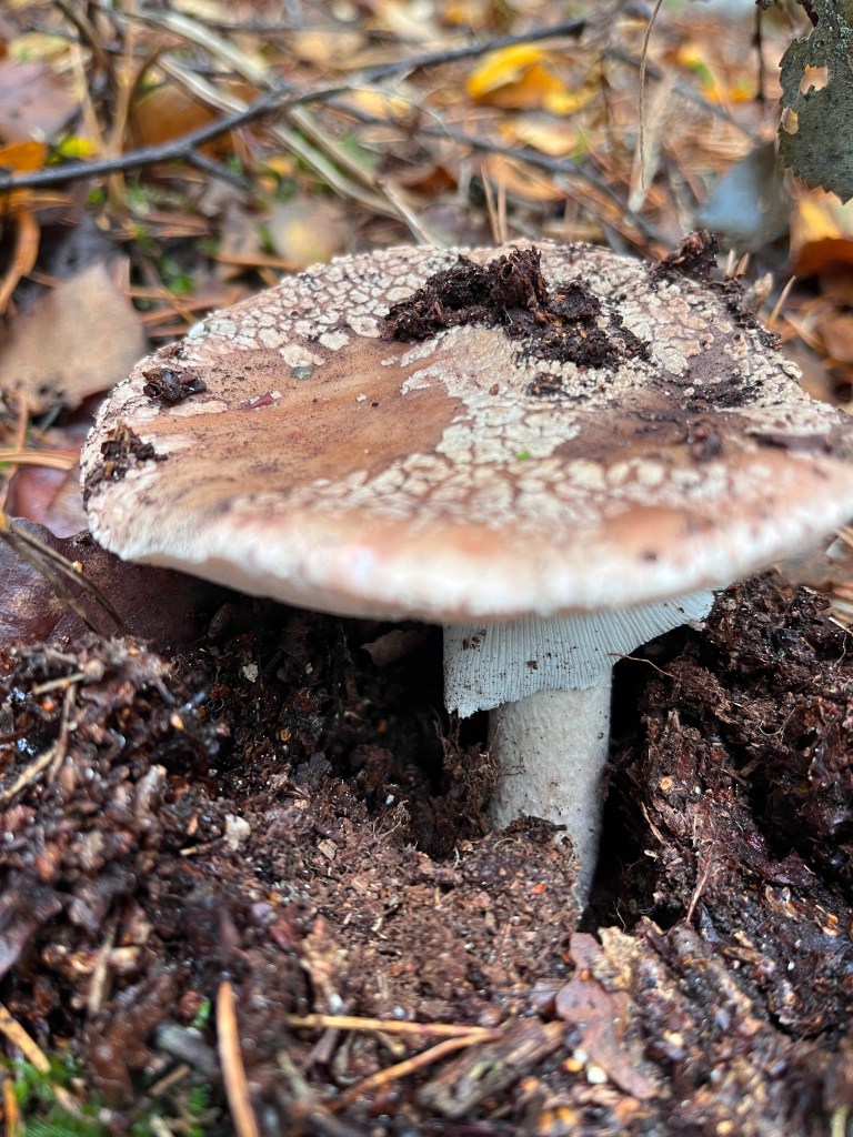 The Blusher (Amanita rubescens) has flesh that ‘blushes’ pinky-red when cut. It has delicate crumbles the same colour as the cap, which is grey-pinky cream. The skirt is striated, unlike poisonous Panther Cap and Fly Agaric which have a smooth ring on the stem.