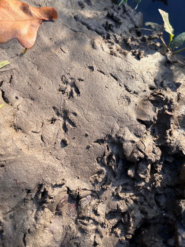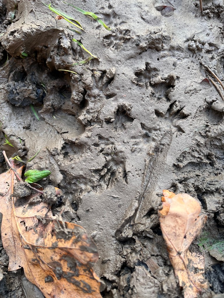 I’ve been spending time learning Track and Sign skills. The wet weather means lots of mud, which preserves some exciting stories like these ones in animal prints and sign.