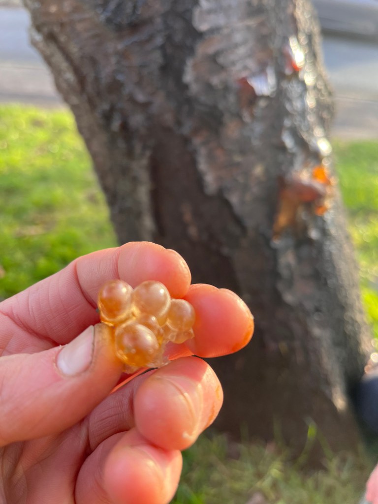 Me and the lad collected some resin from a Cherry Tree with a penknife. We use tree resin to make waterproof glue. Melt it in a pan with equal amounts of ground charcoal and bone powder. Pine trees are great for this. Look for resin in damaged areas caused by weather and pests. (Or tree surgeons.)