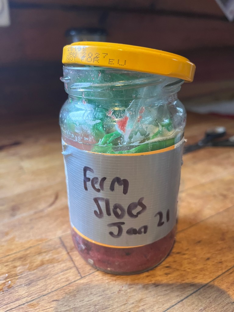 Below, I have squeezed out raw sloe puree and added a pinch of rock salt. I’ve put it in spring water to ferment. Ray Mears and Gordon Hillman explored how Neolithic peoples ate sloes in the book ‘Ray Mears: Wild Food’. Stone Age people fermented sloes in sealed pits dug in the ground. This apparently got rid of the astringency.