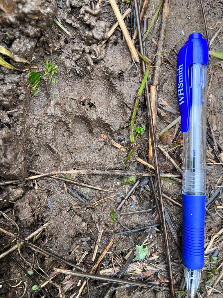 I followed some of these trails through grass, they led through a fence and up an embankment, which led me to suspect badgers. The track below looks to me like an older badger print (notice 5 toes and claw marks – mustelid family) with a dog print registering on top. The dog must’ve been wildly excited!