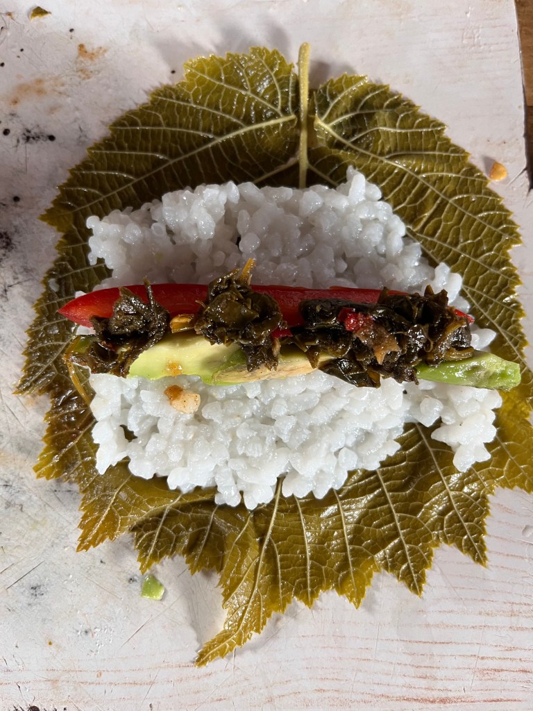 I made Hazel Leaf Sushi with Wild Kimchi for a private forage with the ladies of the Henford Trefoil Guild last Spring.