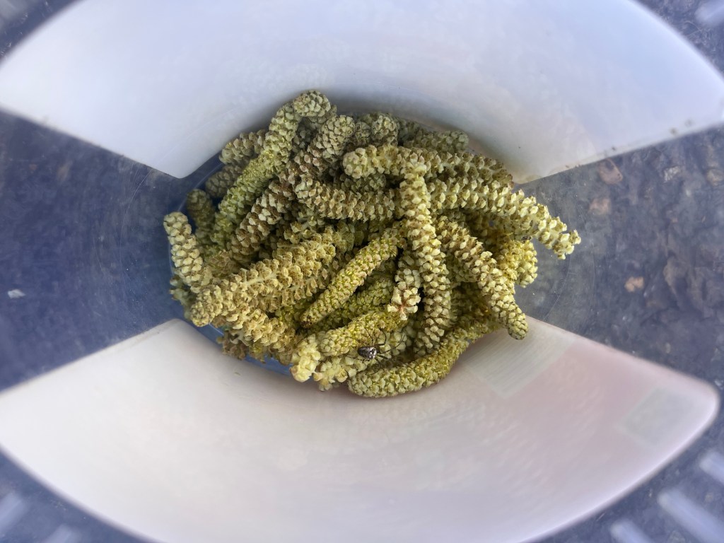 Pick the catkins when they are fully extended (they’re bunched up shorter when unripe) but while they’re still yellow. Once pale orange/umber, they’ve released all their pollen and are too old.